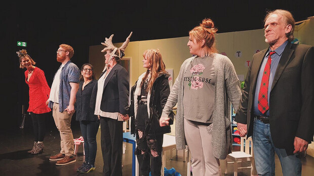 Sista spelningen av uppsättningen av "Pärlplattan" med Universalteatern! Jag i grå outfit som "Siv."